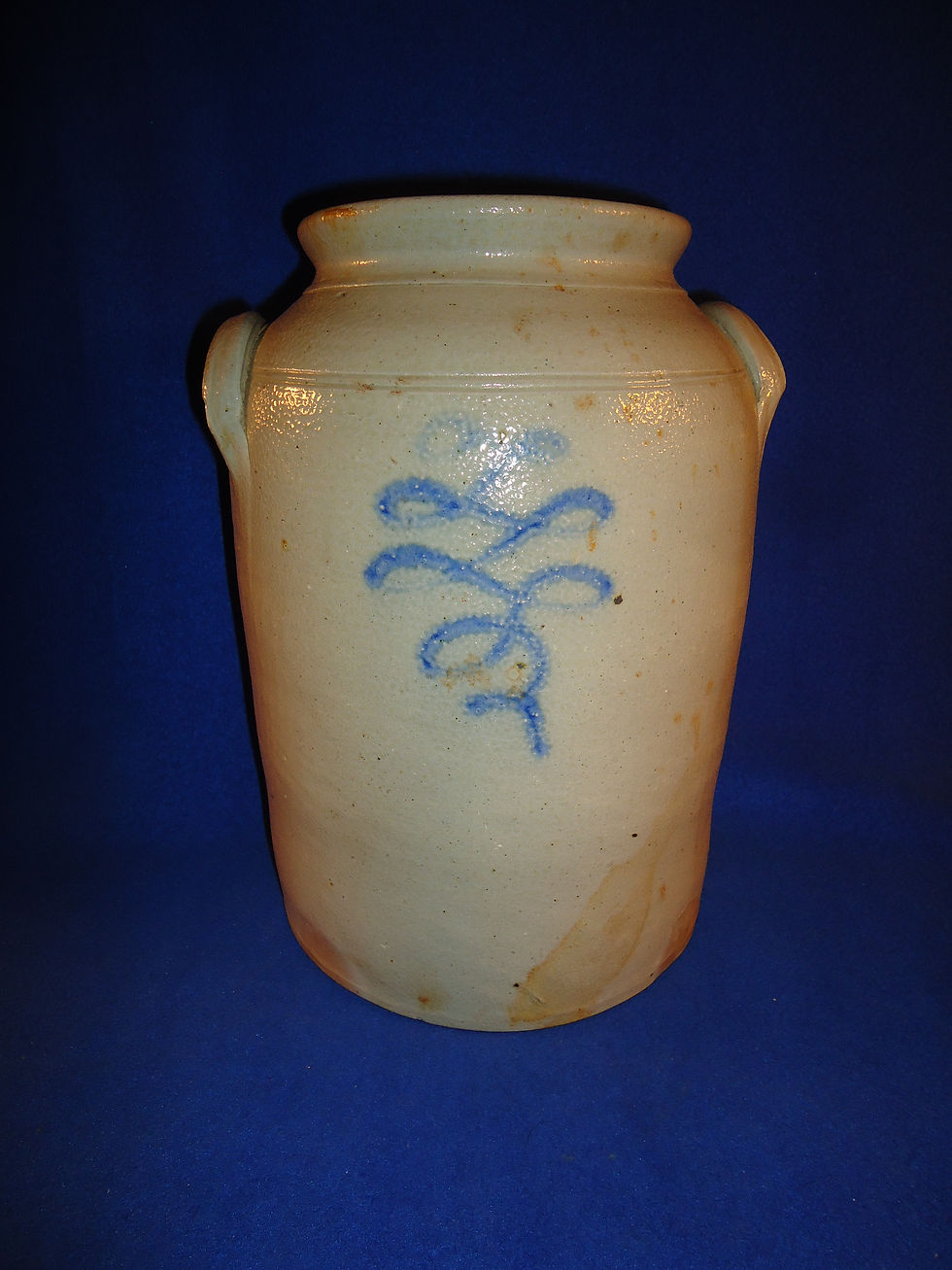 This beauty features a Butter or Cake Crock form with Impressed Advertising Washed in Cobalt. Measures 5 3/4" tall and 10" wide across the top.
