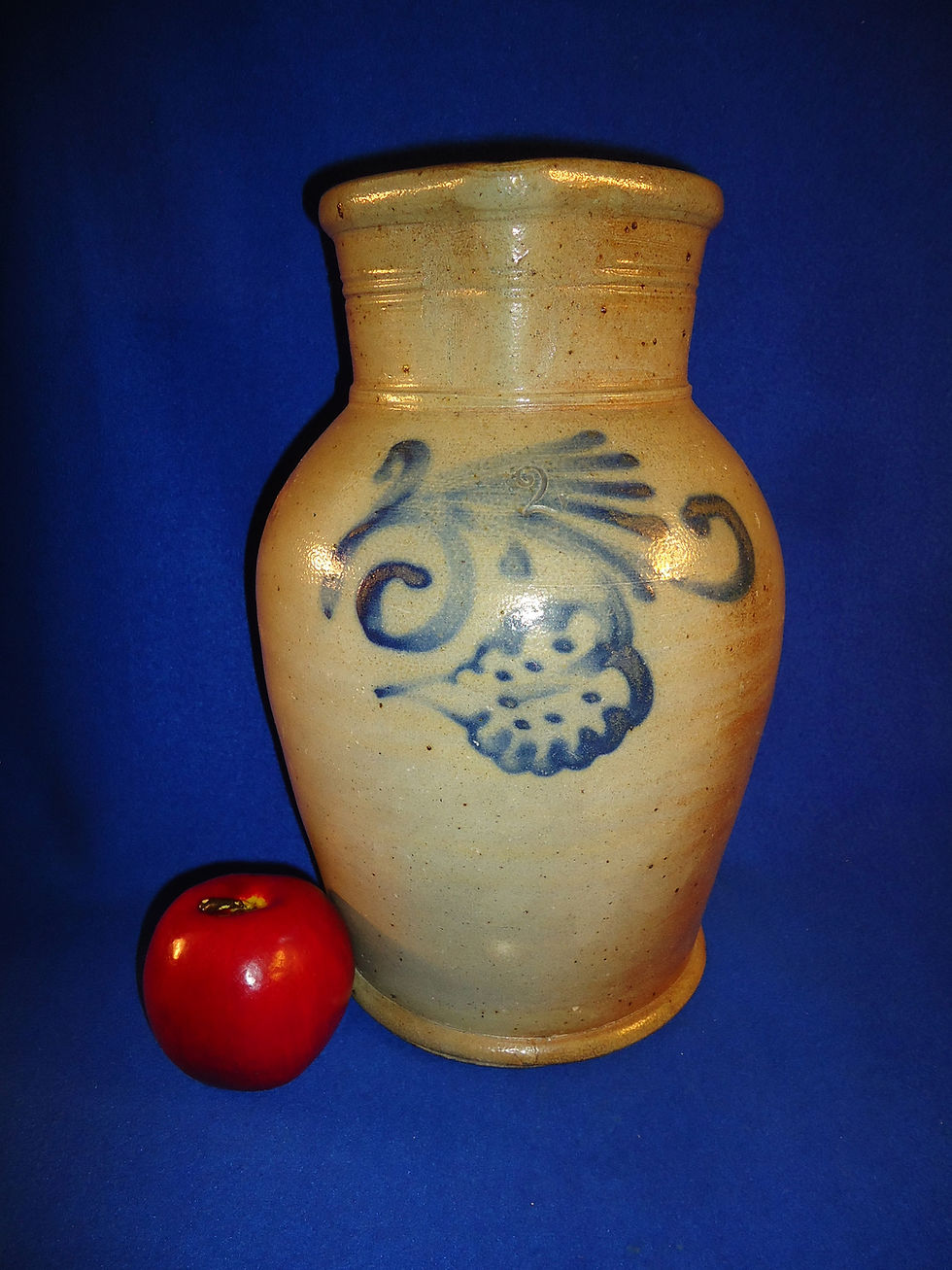 This beauty features a the Pottery Stamp with Cobalt Wash, and the main attraction: a Large Bird on a Floral Decoration. The decoration was executed with a Slip Cup in Brilliant Cobalt Blue. The bird is large- 9" from head to tail- and the floral resembles a rose. The decoration is centered on the jug and fills the front. Stands 14" tall.