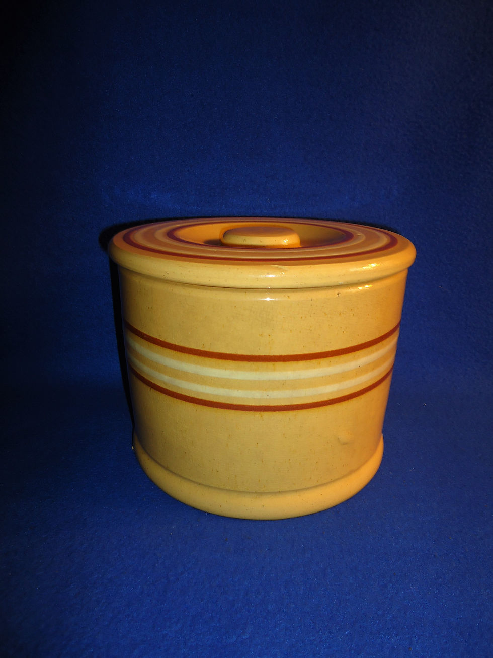 Small Yellow Ware Lidded Butter Crock with Mocha Bands, Pfaltzgraff #5622